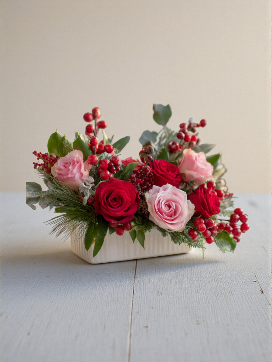 Celebrate the holiday season with elegance and warmth. The Blushing Holiday Charm Centerpiece is a carefully crafted expression of joy, love, and the festive spirit. With a harmonious combination of lush red roses and delicate pink roses, this centerpiece evokes soft romance that complements the celebratory cheer of the holidays.