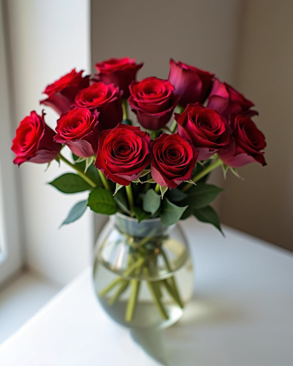 Express your heartfelt emotions with this beautiful arrangement of a dozen red roses. Ideal for anniversaries, birthdays, Valentine’s Day, or just because, this floral gift leaves a lasting impression. The vibrant color of the roses paired with the elegant vase ensures this gift will be cherished and appreciated. Beyond their aesthetic appeal, flowers have a unique ability to uplift spirits and brighten someone’s day—making this bouquet a thoughtful and memorable gesture for friends, family, or loved ones.