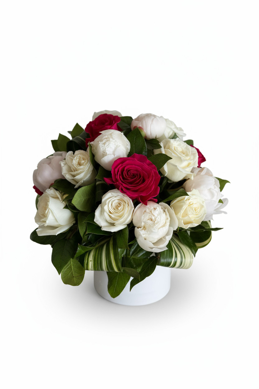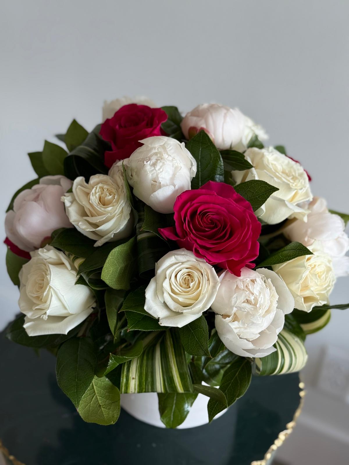 The Linda arrangement features lush peonies and resilient roses that are handpicked for their vivid colors and delicate textures. The soft white blooms symbolize purity and sophistication, while the bold red roses add a touch of romance and intensity. Together, they create a floral ensemble that is both striking and tender, making it perfect for any occasion—be it anniversaries, weddings, or simply as a thoughtful gesture.