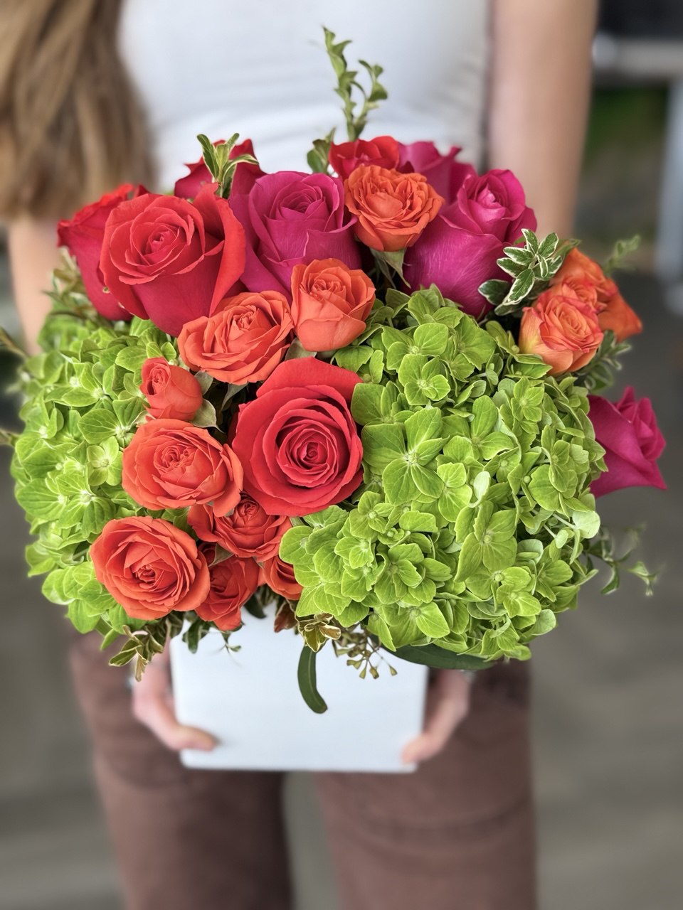 The Miranda flower arrangement is an ideal gift for birthdays, anniversaries, or as a thoughtful gesture for someone special. Its striking colors not only convey affection but also convey joy and celebration. Whether placed on a dining table, a coffee table, or even in a corporate setting, this arrangement is sure to make a lasting impression. Let the enchanting combination of orange and red roses brighten up any room!
