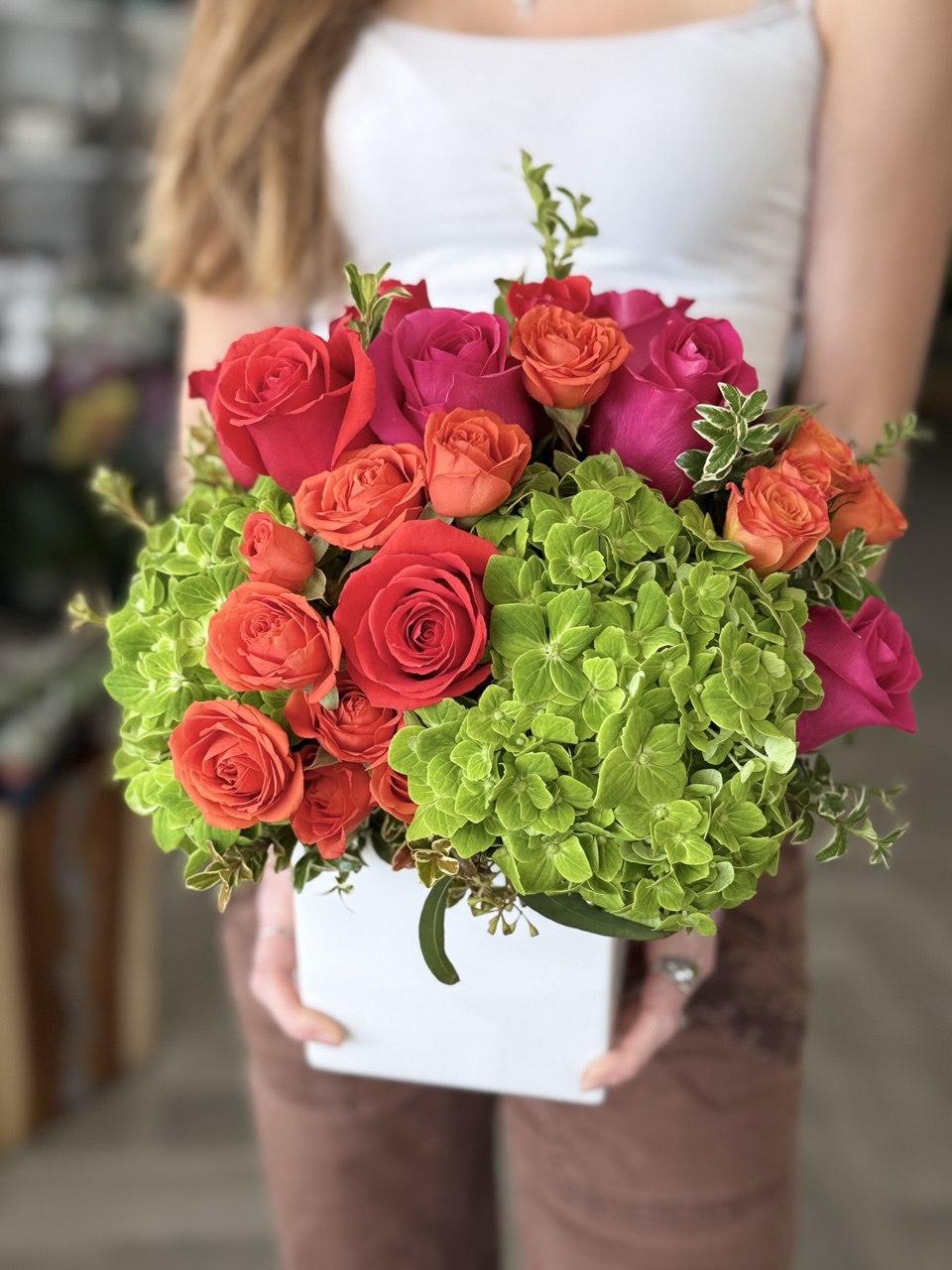 Our flower arrangements are crafted using the freshest blooms, ensuring that you receive a product that not only looks stunning but lasts. Each arrangement is hand-made by skilled florists, ensuring attention to detail and quality in every petal. The vibrant roses are sourced from reputable growers, guaranteeing their brilliance and longevity. Add a touch of nature’s beauty to your environment with the Miranda flower arrangement and experience the joy it brings.