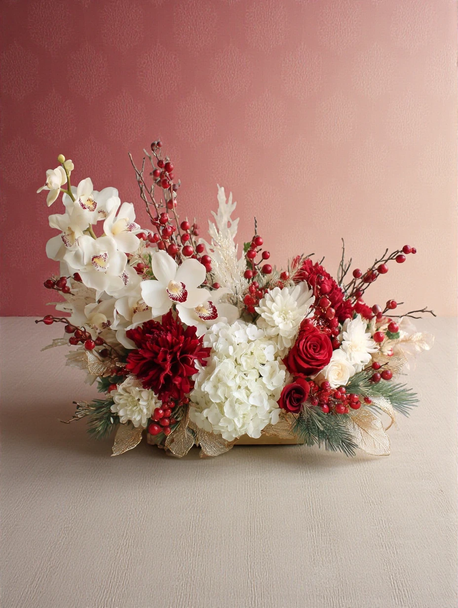 Transform your home, event, or special gathering with the captivating beauty of our flower centerpiece adorned with vibrant red and pristine white blooms. Designed to exude charm and sophistication, this centerpiece is a perfect blend of vivid colors and timeless appeal, making it ideal for both modern and traditional settings. Add a touch of effortless elegance to your decor while creating an inviting space for your guests to admire.